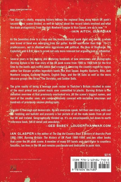 As the Seventies drew to a close and the media declared punk dead and buried, a whole new breed of band was emerging from the gutter. Harder and faster than their ’76–’77 predecessors, not to mention more aggressive and political, the likes of Discharge, the Exploited, and G.B.H. were to prove not only more relevant but arguably just as influential. Several years in the making and featuring hundreds of new interviews and photographs, Burning Britain is the true story of the UK punk scene from 1980 to 1984 told for the first time by the bands and record labels that created it. Covering the country region by region, author Ian Glasper profiles legendary bands like Vice Squad, Angelic Upstarts, Blitz, Anti-Nowhere League, Cockney Rejects, and the UK Subs as well as the more obscure groups like Xtract, The Skroteez, and Soldier Dolls. The grim reality of being a teenage punk rocker in Thatcher’s Britain resulted in some of the most primal and potent music ever committed to plastic. Burning Britain is the definitive overview of that previously overlooked era.