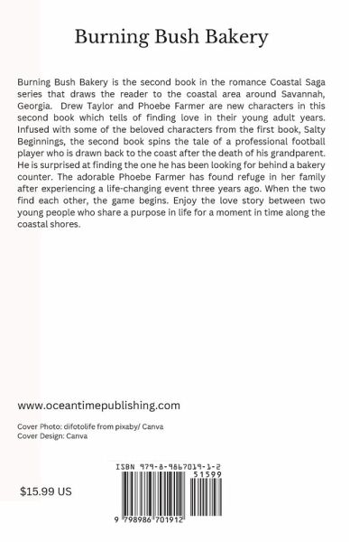 Burning Bush Bakery is the second book in the romance Coastal Saga series that draws the reader to the coastal area around Savannah, Georgia. Andrew Taylor and Phoebe Farmer are new characters in this second book which tells of finding true love in their young adult years. Infused with some of the loved characters from the first book in the series, Salty Beginnings, the second book spins the tale of a professional football player who is drawn back to the coast after the death of his grandparent. He is surprised at finding the one he has been looking for behind a bakery counter. The adorable Phoebe Farmer has found refuge in her family after experiencing a life-changing event three years ago. When the two find each other, the game starts. Enjoy the love story between two young people who share a purpose in life for a moment in time along the coastal shores.