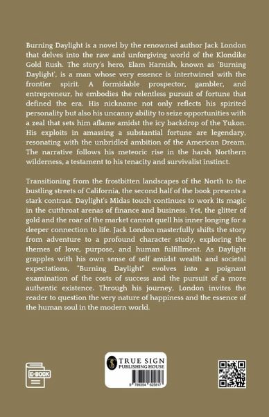 ""Burning Daylight"" is a compelling novel by Jack London, renowned for its exploration of the American dream and the pursuit of wealth and success. Set in the rugged landscape of the Yukon during the Klondike Gold Rush, the story follows the charismatic and ambitious protagonist, Elam Harnish, known as Burning Daylight, as he rises from humble beginnings to become a wealthy and influential figure in the Alaskan wilderness. Driven by a relentless desire for adventure and fortune, Burning Daylight navigates the treacherous world of business and politics, facing both allies and adversaries in his quest for power and prestige. Along the way, he forms relationships with a colorful cast of characters, including fellow prospectors, savvy businesswomen, and cunning rivals. As Burning Daylight grapples with the complexities of wealth and ambition, London offers a poignant commentary on the nature of success and the sacrifices it entails. With its vivid descriptions, dynamic characters, and thought-provoking themes, ""Burning Daylight"" remains a timeless exploration of the human spirit and the pursuit of the elusive American dream.