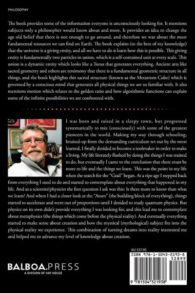 The book provides some of the information everyone is unconsciously looking for. It mentions subjects only a philosopher would know about and more. It provides an idea to change the age old belief that there is not enough to go around, and therefore we war about the most fundamental resources we can find on Earth. The book explains (to the best of my knowledge) that the universe is a giving entity, and all we have to do is learn how this is possible. This giving entity is fundamentally two particles in union, which is a self-contained unit at every scale. This union is a dynamic entity which looks like a Torus that generates everything. Ancient arts like sacred geometry and others are testimony that there is a fundamental geometric structure in all things, and the book highlights this sacred structure (known as the Metatrons Cube) which is governed by a conscious mind that generates all physical things we are so familiar with. It also mentions motion which relates to the golden ratio and how algorithmic functions can explain some of the infinite possibilities we are confronted with.