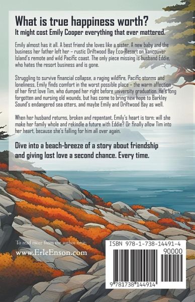 What is true happiness worth? It might cost Emily Cooper everything that ever mattered. Emily almost has it all. A best friend she loves like a sister. A new baby and the business her father left her - rustic Driftwood Bay Eco-Resort on Vancouver Island's remote and wild Pacific coast. The only piece missing is husband Eddie, who hates the resort business and is gone. Struggling to survive financial collapse, a raging wildfire, Pacific storms and loneliness, Emily finds comfort in the worst possible place - the warm affection of her first love Tim, who dumped her right before university graduation. He's long forgotten and nursing old wounds, but has come to bring new hope to Barkley Sound's endangered sea otters, and maybe Emily and Driftwood Bay as well. When her husband returns, broken and repentant, Emily's heart is torn: will she make her family whole and rekindle a future with Eddie? Or finally allow Tim into her heart, because she's falling for him all over again. Dive into a brisk beach-breeze of a story about friendship and giving lost love a second chance. Every time.