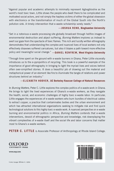 Global trade in electronic waste (e-waste) has led to various waste management challenges and many regions of the Global South have suffered the toxic consequences. In Burning Matters, Peter C. Little explores the complex cultural, economic, and environmental health politics of e-waste work in Ghana. He brings to light the lived experiences of Ghana's e-waste workers, as they navigate the health, social, and economic challenges of highly toxic e-waste labor. In particular, Little engages the experiences of e-waste workers who burn bundles of electrical cables to extract copper, a practice that contaminates bodies and the urban environment and which has attracted international organizations seeking to mitigate risk and find quick tech solutions to this highly toxic e-waste work. A nuanced perspective on e-waste burning and environmental politics in Africa at a time when global e-waste generation and trade is at an all-time high, Burning Matters contends that e-waste interventions devoid of ethnographic perspective and knowledge risk downplaying the vibrant complexities of e-waste itself and the matters of social life and labor that matter most to Ghana's e-waste workers.