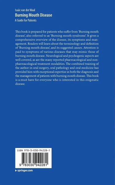 This book is prepared for patients who suffer from 'Burning mouth disease', also referred to as 'Burning mouth syndrome'. It gives a comprehensive overview of the disease, its symptoms and management. Readers will learn about the terminology and definition of 'Burning mouth disease', and its suggested causes. Attention is paid to symptoms of various diseases that may mimic those of burning mouth disease. Neurological and psychogenic aspects are well covered, as are the many reported pharmacological and non-pharmacological treatment modalities.