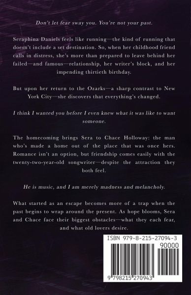 Don't let fear sway you. You're not your past. Seraphina Daniels feels like running--the kind of running that doesn't include a set destination. So, when her childhood friend calls in distress, she's more than prepared to leave behind her failed--and famous--relationship, her writer's block, and her impending thirtieth birthday. But upon her return to the Ozarks--a sharp contrast to New York City--she discovers that everything's changed. I think I wanted you before I even knew what it was like to want someone. The homecoming brings Sera to Chace Holloway: the man who's made a home out of the place that was once hers. Romance isn't an option, but friendship comes easily with the twenty-two-year-old songwriter--despite the attraction they both feel. He is music, and I am merely madness and melancholy. What started as an escape becomes more of a trap when the past begins to wrap around the present. As hope blooms, Sera and Chace face their biggest obstacles--what they each fear, and what old lovers desire.