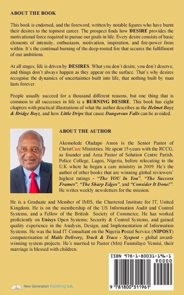 This book is endorsed, and the foreword, written by notable figures who have burnt their desires to the topmost career. The prospect finds how DESIRE provides the motivational force required to pursue our goals in life. Every desire consists of basic elements of intensity, enthusiasm, motivation, inspiration, and fire-power from within. It's the continual burning of the deep-rooted fire that secures the fulfillment of our ambitions. At all stages, life is driven by DESIRES. What you don't desire, you don't deserve, and things don't always happen as they appear on the surface. That's why desires recognise the dynamics of uncertainties built into life, that nothing built by man lasts forever. People usually succeed for a thousand different reasons, but one thing that is common to all successes in life is a BURNING DESIRE. This book has eight chapters with practical illustrations of what the author describes as the Helmet Boyz & Bridge Boyz, and how Little Drips that cause Dangerous Falls can be avoided.