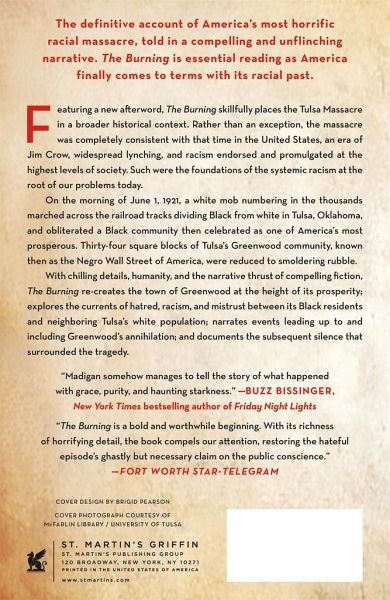 Includes an All-New Afterword. An unflinching account of America's most horrific racial massacre, The Burning is essential reading as America finally comes to terms with its racial past. When first published in 2001, society apparently wasn't ready for such an unstinting narrative. After it was published, The Burning, like its subject matter, remained unknown to most in America. That has changed dramatically. "I began to suspect that a crucial piece remained missing from America's long attempts at racial reconciliation," Madigan wrote in 2001 in the author's note to The Burning. "Too many in this country remained as ignorant as I was. Too many were just as oblivious to some of the darkest moments in our history, a legacy of which Tulsa is both a tragic example and a shameful metaphor. How can we heal when we don't know what we're healing from?" Now, 100 years after the massacre, Madigan brings new resonance to these questions in the reissue of this definitive work of American history. Featuring a brand new afterword, The Burning skillfully places the Tulsa Massacre in a broader historical context. Rather than an exception, the massacre was completely consistent with that time in the United States, an era of Jim Crow, widespread lynching, and racism endorsed and promulgated at the highest levels of society. Such were the foundations of the systemic racism at the root of our problems today. On the morning of June 1, 1921, a white mob numbering in the thousands marched across the railroad tracks dividing Black from white in Tulsa, Oklahoma, and obliterated a Black community then celebrated as one of America's most prosperous. 34 square blocks of Tulsa's Greenwood community, known then as the Negro Wall Street of America, were reduced to smoldering rubble. And now, 100 years later, the death toll of what is known as the Tulsa Race Massacre is more difficult to pinpoint. Conservative estimates put the number of dead at about 100 (75% of the victims are believed to have been Black), but the actual number of casualties could be triple that. The Tulsa Race Riot Commission, formed to determine exactly what happened, has recommended that restitution to the historic Greenwood Community would be good public policy and do much to repair the emotional as well as physical scars of this most terrible incident in our shared past. With chilling details, humanity, and the narrative thrust of compelling fiction, The Burning recreates the town of Greenwood at the height of its prosperity, explores the currents of hatred, racism, and mistrust between its Black residents and neighboring Tulsa's white population, narrates events leading up to and including Greenwood's annihilation, and documents the subsequent silence that surrounded the tragedy.