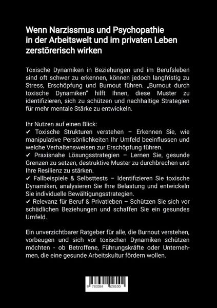 Dieses Buch bietet eine tiefgehende Auseinandersetzung mit den Ursachen und Auswirkungen toxischer Dynamiken in zwischenmenschlichen Beziehungen und beruflichen Strukturen. Es zeigt praxisnahe Strategien auf, um schädliche Muster zu erkennen, sich vor ihnen zu schützen und langfristig gesunde Grenzen zu setzen.Ein besonderer Fokus liegt auf der Rolle manipulativer Persönlichkeiten - insbesondere von Narzissten und Psychopathen - und deren Einfluss auf das Arbeitsumfeld sowie das private Leben. Solche destruktiven Strukturen führen häufig zu chronischem Stress, emotionaler Erschöpfung und in vielen Fällen zu Burnout.Anhand praxisnaher Fallbeispiele und konkreter Handlungsempfehlungen lernen Leserinnen und Leser, wie sie ihre persönliche Resilienz stärken, sich aus belastenden Situationen befreien und ein gesundes, stabiles Umfeld schaffen können - sowohl im beruflichen als auch im privaten Bereich.Dieses Buch richtet sich an:- Betroffene, die Wege aus belastenden Beziehungen oder einem Burnout suchen.- Führungskräfte und Personalverantwortliche, die ein unterstützendes und resilientes Arbeitsumfeld gestalten möchten.- Unternehmen, die präventiv gegen toxische Strukturen vorgehen und eine gesunde Unternehmenskultur etablieren wollen."Burnout durch toxische Dynamiken" vermittelt ein umfassendes Verständnis für die subtilen, aber folgenschweren Mechanismen toxischer Beziehungen und bietet praktische Lösungsansätze, um sich nachhaltig zu schützen und neue Perspektiven zu entwickeln.