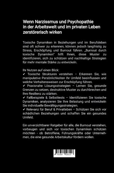 Dieses Buch bietet eine tiefgehende Auseinandersetzung mit den Ursachen und Auswirkungen toxischer Dynamiken in zwischenmenschlichen Beziehungen und beruflichen Strukturen. Es zeigt praxisnahe Strategien auf, um schädliche Muster zu erkennen, sich vor ihnen zu schützen und langfristig gesunde Grenzen zu setzen.Ein besonderer Fokus liegt auf der Rolle manipulativer Persönlichkeiten - insbesondere von Narzissten und Psychopathen - und deren Einfluss auf das Arbeitsumfeld sowie das private Leben. Solche destruktiven Strukturen führen häufig zu chronischem Stress, emotionaler Erschöpfung und in vielen Fällen zu Burnout.Anhand praxisnaher Fallbeispiele und konkreter Handlungsempfehlungen lernen Leserinnen und Leser, wie sie ihre persönliche Resilienz stärken, sich aus belastenden Situationen befreien und ein gesundes, stabiles Umfeld schaffen können - sowohl im beruflichen als auch im privaten Bereich.Dieses Buch richtet sich an:- Betroffene, die Wege aus belastenden Beziehungen oder einem Burnout suchen.- Führungskräfte und Personalverantwortliche, die ein unterstützendes und resilientes Arbeitsumfeld gestalten möchten.- Unternehmen, die präventiv gegen toxische Strukturen vorgehen und eine gesunde Unternehmenskultur etablieren wollen."Burnout durch toxische Dynamiken" vermittelt ein umfassendes Verständnis für die subtilen, aber folgenschweren Mechanismen toxischer Beziehungen und bietet praktische Lösungsansätze, um sich nachhaltig zu schützen und neue Perspektiven zu entwickeln.