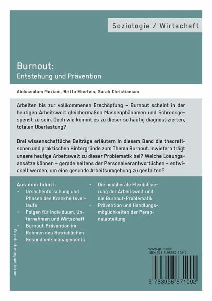 Arbeiten bis zur vollkommenen Erschöpfung - Burnout scheint in der heutigen Arbeitswelt gleichermaßen Massenphänomen und Schreckgespenst zu sein. Doch wie kommt es zu dieser so häufig diagnostizierten, totalen Überlastung?Drei wissenschaftliche Beiträge erläutern in diesem Band die theoretischen und praktischen Hintergründe zum Thema Burnout. Inwiefern trägt unsere heutige Arbeitswelt zu dieser Problematik bei? Welche Lösungsansätze können - gerade seitens der Personalverantwortlichen - entwickelt werden, um eine gesunde Arbeitsumgebung zu gestalten?Aus dem Inhalt:Ursachenforschung und Phasen des KrankheitsverlaufsFolgen für Individuum, Unternehmen und WirtschaftBurnout-Prävention im Rahmen des Betrieblichen GesundheitsmanagementsDie neoliberale Flexibilisierung der Arbeitswelt und die Burnout-ProblematikPrävention und Handlungsmöglichkeiten der Personalabteilung