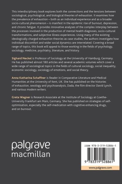 Introduction; Sighard Neckel, Anna Katharina Schaffner and Greta Wagner.- Part I. Cultural-Historical Perspectives.- Chapter 1. Pre-Modern Exhaustion: On Melancholia and Acedia; Anna Katharina Schaffner.- Chapter 2. Neurasthenia and Managerial Disease in Germany and America: Transnational Ties and National Characteristics in the Field of Exhaustion 1880-1960; Patrick Kury.- Part II. Exhaustion syndromes.- Chapter 3. Exhaustion Syndromes: Concepts and Definitions; Johanna M. Doerr and Urs M. Natter.- Chapter 4. Burnout: A Short Socio-Cultural History; Wilmar Schaufeli.- Chapter 5. Burnout: From Work-Related Stress to a Cover-Up Diagnosis; Linda V. Heinemann and Torsten.- Part III. Exhaustion and Self-Realization.- Chapter 6. What We Talk About When We Talk About Mental Health: Toward anAnthropology of Adversity in Individualistic Society; Alain Ehrenberg.- Chapter 7. Self-Realization through Work and its Failure; Elin Thunman and Marcus Persson.- Chapter 8. Exhaustion and Euphoria: Self-Medication with Amphetamines; Greta Wagner.- Part IV. Exhaustion discourses.- Chapter 9. Rechargeable Man in a Hamster Wheel World: Contours of a Trendsetting Illness; Ulrich Bröckling.- Chapter 10. Literary Exhaustion; Michael Greaney.- Part V. Exhaustion and the Social.- Chapter 11. Social Agony and Agonizing Social Constructions; Iain Wilkinson.- Chapter 12. Exhaustion as a Sign of the Present; Sighard Neckel and Greta Wagner.- Conclusion; Sighard Neckel, Anna Katharina Schaffner and Greta Wagner.