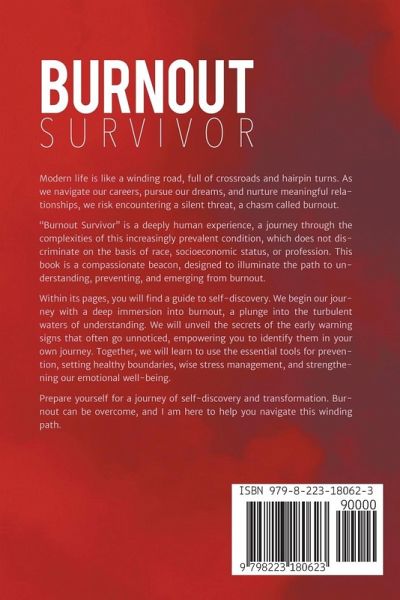 Modern life is like a winding road, full of crossroads and hairpin turns. As we navigate our careers, pursue our dreams, and nurture meaningful relationships, we risk encountering a silent threat, a chasm called burnout. "Burnout Survivor" is a deeply human experience, a journey through the complexities of this increasingly prevalent condition, which does not discriminate on the basis of race, socioeconomic status, or profession. This book is a compassionate beacon, designed to illuminate the path to understanding, preventing, and emerging from burnout. Within its pages, you will find a guide to self-discovery. We begin our journey with a deep immersion into burnout, a plunge into the turbulent waters of understanding. We will unveil the secrets of the early warning signs that often go unnoticed, empowering you to identify them in your own journey. Together, we will learn to use the essential tools for prevention, setting healthy boundaries, wise stress management, and strengthening our emotional well-being. Prepare yourself for a journey of self-discovery and transformation. Burnout can be overcome, and I am here to help you navigate this winding path.
