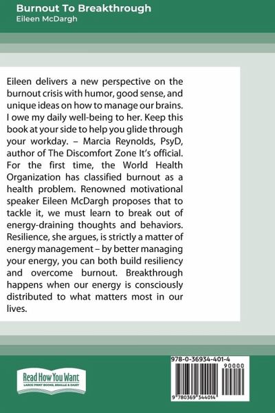Eileen delivers a new perspective on the burnout crisis with humor, good sense, and unique ideas on how to manage our brains. I owe my daily well-being to her. Keep this book at your side to help you glide through your workday. --Marcia Reynolds, PsyD, author of The Discomfort Zone It's official. For the first time, the World Health Organization has classified burnout as a health problem. Renowned motivational speaker Eileen McDargh proposes that to tackle it, we must learn to break out of energy-draining thoughts and behaviors. Resilience, she argues, is strictly a matter of energy management--by better managing your energy, you can both build resiliency and overcome burnout. Breakthrough happens when our energy is consciously distributed to what matters most in our lives. So after a short survey that will tell you where you fit in a burnout and resiliency profile, McDargh helps pinpoint the causes of your burnout and examine the energy demands that keep you from refueling and recharging. She provides an in-depth energy analysis and gives you the keys to master the four dimensions that can give you a resilience breakthrough: head, heart, hands, and humor. McDargh guides the reader through the process of identifying energy drains and implementing strategies for handling them, whatever phase of life you are in. Her intention is to help you not only to successfully manage work and life demands but also make even larger strides in understanding how to put together a life by design and not by default.