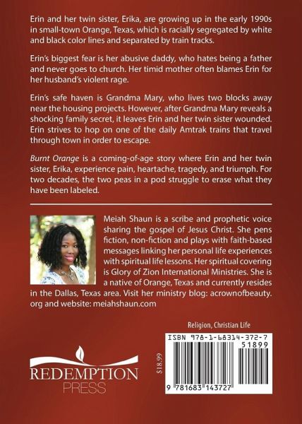 Erin and her twin sister, Erika, are growing up in the early 1990s in small-town Orange, Texas, which is racially segregated by white and black color lines and separated by train tracks. Erin’s biggest fear is her abusive daddy, who hates being a father and never goes to church. Her timid mother often blames Erin for her husband’s violent rage. Erin’s safe haven is Grandma Mary, who lives two blocks away near the housing projects. However, after Grandma Mary reveals a shocking family secret, it leaves Erin and her twin sister wounded. Erin strives to hop on one of the daily Amtrak trains that travel through town in order to escape. Burnt Orange is a coming-of-age story where Erin and her twin sister, Erika, experience pain, heartache, tragedy, and triumph. For two decades, the two peas in a pod struggle to erase what they have been labeled. Meiah Shaun is a scribe and prophetic voice sharing the gospel of Jesus Christ. She pens fi ction, non-fi ction and plays with faith-based messages linking her personal life experiences with spiritual life lessons. Her spiritual covering is Glory of Zion International Ministries. She is a native of Orange, Texas and currently resides in the Dallas, Texas area. Visit her ministry blog: acrownofbeauty. org and website: meiahshaun.com