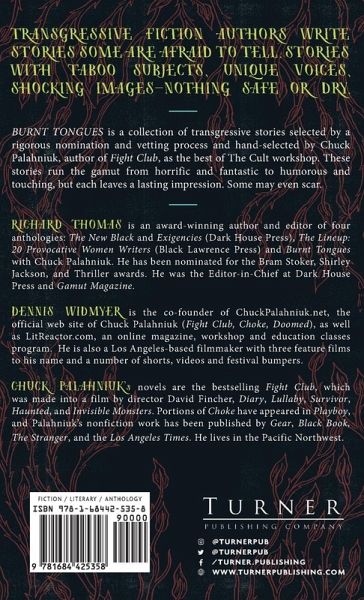 Burnt Tongues is a collection of transgressive stories selected by a rigorous nomination and vetting process and hand-selected by Chuck Palahniuk, author of Fight Club, as the best of The Cult workshop. These stories run the gamut from horrific and fantastic to humorous and touching, but each leaves a lasting impression.