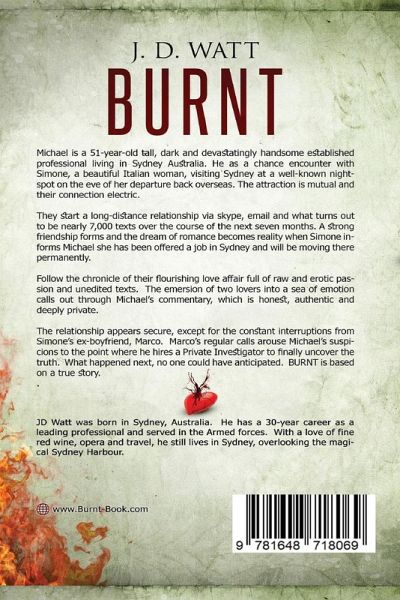 Michael is a 51-year-old tall, dark and devastatingly handsome established professional living in Sydney Australia. He has a chance encounter with Simone, a beautiful Italian woman, visiting Sydney at a well-known nightspot on the eve of her departure back overseas. The attraction is mutual and their connection electric. They start a long-distance relationship via skype, email and what turns out to be nearly 7,000 texts over the course of the next seven months. A strong friendship forms and the dream of romance becomes reality when Simone informs Michael she has been offered a job in Sydney and will be moving there permanently. Follow the chronicle of their flourishing love affair full of raw and erotic passion and unedited texts. The emersion of two lovers into a sea of emotion calls out through Michael's commentary. It is honest, authentic and deeply private. The relationship appears secure, except for the constant interruptions from Simone's ex-boyfriend, Marco. Marco's regular calls arouse Michael's suspicions to the point where he hires a Private Investigator to finally uncover the truth. What happened next, no one could have anticipated. BURNT is based on a true story.