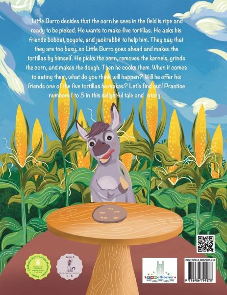 Little Burro decides that the corn he sees in the field is ripe and ready to be picked. He wants to make five tortillas. He asks his friends bobcat, coyote and jackrabbit to help him. They say that they are too busy, so little Burro goes ahead and makes the tortillas by himself. He picks the corn, remove the kernels, grinds the corn and makes the dough. Then he cooks them. When it comes to eating them, what do you think will happen? Will he offer his friends one of the five tortillas he makes? Let's find out! Practice numbers 1 to 5 in this delightful tale and story.