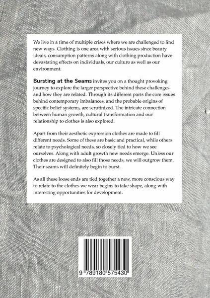 We live in a time of multiple crises where we are challenged to find new ways. Clothing is one area with serious issues since beauty ideals, consumption patterns along with clothing production have devastating effects on individual, cultural as well as environmental levels. Bursting at the Seams invites you on a thought provoking journey to explore the larger perspective behind these challenges and how they are related. Through its different parts the core issues behind contemporary imbalances, and the probable origins of specific belief systems, are scrutinized. The intricate connection between human growth, cultural transformation and our relationship to clothes is also explored. Apart from their aesthetic expression clothes are made to fill different needs. Some of these are basic and practical, while others relate to psychological needs, so closely tied to how we see ourselves. Along with adult growth new needs emerge. Unless our clothes are designed to also fill those needs, we will outgrow them. Their seams will begin to burst. As all these loose ends are tied together a new, more conscious way to relate to the clothes we wear begins to take shape, along with interesting opportunities for development.