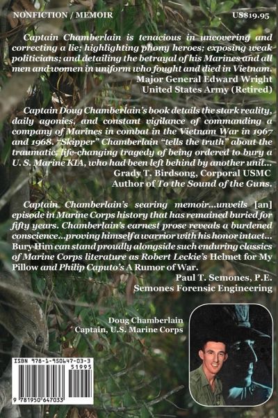 In this frank, engaging memoir, Captain Chamberlain chronicles the missions, personal courage and sacrifice of the Marines he was privileged to command; painfully recalls the unspeakable order he and his Marines were forced to obey; and the cover-up which followed. Nearly four decades later, Captain Chamberlain makes right what was wrong; brings closure to the family of a fallen and abandoned warrior; and attempts to put to rest the guilt which plagued his military career and life. Unlike most books on the Viet Nam War, this book is written at a tactical level by a Marine Company Commander who was there.