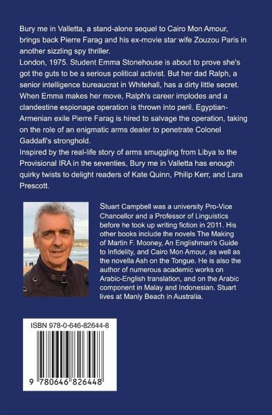Bury me in Valletta, a stand-alone sequel to Cairo Mon Amour, brings back Pierre Farag and his ex-movie star wife Zouzou Paris in another sizzling spy thriller. London, 1975. Student Emma Stonehouse is about to prove she's got the guts to be a serious political activist. But her dad Ralph, a senior intelligence bureaucrat in Whitehall, has a dirty little secret. When Emma makes her move, Ralph's career implodes and a clandestine espionage operation is thrown into peril. Egyptian-Armenian exile Pierre Farag is hired to salvage the operation, taking on the role of an enigmatic arms dealer to penetrate Colonel Gaddafi's stronghold. Inspired by the real-life story of arms smuggling from Libya to the Provisional IRA in the seventies, Bury me in Valletta has enough quirky twists to delight readers of Kate Quinn, Philip Kerr, and Lara Prescott.