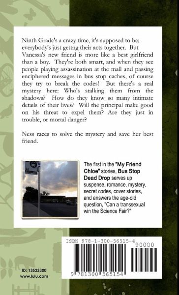 Ninth Grade's crazy, it's supposed to be; everybody's just getting their act together. But Vanessa's new friend is more like a best girlfriend than a boy. They're both smart, and when they see people playing assassination at the mall and passing enciphered messages in bus stop caches, of course they try to break the codes! But there's a real mystery here: Who's stalking them from the shadows? How do they know so many intimate details of their lives? Will the principal make good on his threat to expel them? Are they just in trouble, or mortal danger? Ness races to solve the mystery and save her best friend. The first in the "My Friend Chloe" stories, Bus Stop Dead Drop serves up suspense, romance, mystery, secret codes, cover stories, and answers the age-old question, "Can a transsexual win the Science Fair?"