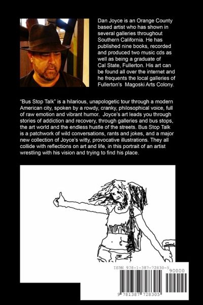 Dan Joyce's "Bus Stop Talk" is a hilarious, unapologetic tour through a modern American city, spoken by a rowdy, cranky, philosophical voice, full of raw emotion and vibrant humor. Joyce's art leads you through stories of addiction and recovery, through galleries and bus stops, the art world and the endless hustle of the streets.Bus Stop Talk is a patchwork of wild conversations, rants and jokes, and a major new collection of Joyce's witty, provocative illustrations. They all collide with reflections on art and life, in this portrait of an artist wrestling with his vision and trying to find his place.