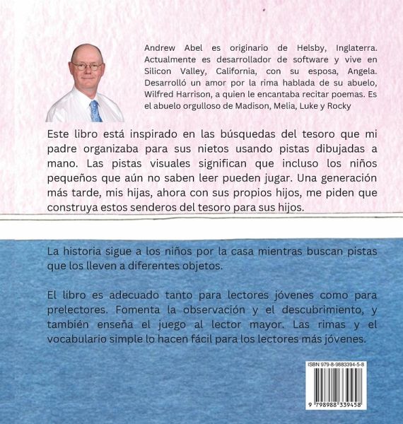 Este libro está inspirado en las búsquedas del tesoro que mi padre organizaba para sus nietos usando pistas dibujadas a mano. Las pistas visuales significan que incluso los niños pequeños que aún no saben leer pueden jugar. Una generación más tarde, mis hijas, ahora con sus propios hijos, me piden que construya estos senderos del tesoro para sus hijos. La historia sigue a los niños por la casa mientras buscan pistas que los lleven a diferentes objetos. El libro es adecuado tanto para lectores jóvenes como para prelectores. Fomenta la observación y el descubrimiento, y también enseña el juego al lector mayor. Las rimas y el vocabulario simple lo hacen fácil para los lectores más jóvenes.