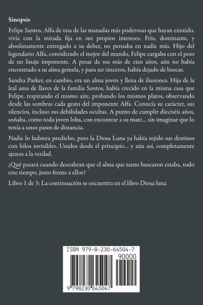 7 Beneficios de leer esta historiaTe sumerge en un mundo sobrenatural lleno de magia y misterio Vivirás en un universo donde la Diosa Luna guía los destinos y el amor trasciende el tiempo, despertando tu imaginación y sentido del asombro. Conectas con emociones intensas y profundas La historia de un Alfa dominante y una joven inocente te hará experimentar una montaña rusa emocional: deseo, duda, miedo, esperanza... ¡todo en un solo libro! Exploras el tema del amor predestinado Este tipo de lectura te hace reflexionar sobre el concepto de almas gemelas y cómo el destino puede unir a dos personas aunque sean polos opuestos. Disfrutas de una lectura adictiva y atrapante Con cada capítulo, querrás saber más. El misterio de cuándo y cómo descubrirán que están hechos el uno para el otro te mantendrá pegado a las páginas. Te permite escapar de la rutina Leer sobre manadas, alfas, transformaciones y vínculos sobrenaturales te transporta a una realidad alternativa donde todo es posible... incluso el amor eterno. Desarrollas empatía con personajes complejos Entender a Felipe, con su dureza y pasado, y a Sandra, con su inocencia y valentía, te ayuda a ponerte en el lugar de otros, incluso en mundos fantásticos. Te inspira a creer en el poder del destino y del amor verdadero A pesar de las diferencias, los miedos y las dudas, esta historia te recuerda que el amor encuentra el camino... incluso si está justo frente a tus ojos. Sinopsis Felipe Santos, Alfa de una de las manadas más poderosas que hayan existido, vivía con la mirada fija en sus propios intereses. Frío, dominante, y absolutamente entregado a su deber, no pensaba en nadie más. Hijo del legendario Alfa, considerado el mejor del mundo, Felipe cargaba con el peso de un linaje imponente. A pesar de sus más de cien años, aún no había encontrado a su alma gemela, y para ser sinceros, había dejado de buscar. Sandra Parker, en cambio, era un alma joven y llena de ilusiones. Hija de la leal ama de llaves de la familia Santos, había crecido en la misma casa que Felipe, respirando el mismo aire, probando los mismos platos, observando desde las sombras cada gesto del imponente Alfa. Conocía su carácter, sus silencios, incluso sus debilidades ocultas. A punto de cumplir dieciséis años, soñaba, como toda joven loba, con encontrar a su mate... sin imaginar que lo tenía a unos pasos de distancia. Nadie lo hubiera predicho, pero la Diosa Luna ya había tejido sus destinos con hilos invisibles. Unidos desde el principio... y aún así, completamente ajenos a la verdad. ¿Qué pasará cuando descubran que el alma que tanto buscaron estaba, todo este tiempo, justo frente a ellos? Libro 1 de 3: La continuación se encuentra en el libro Diosa luna