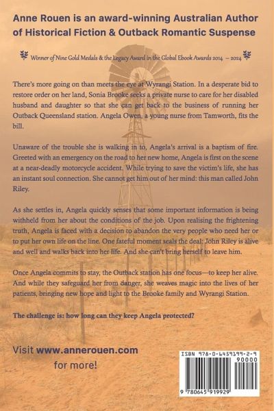 There's more going on than meets the eye at Wyrangi Station. In a desperate bid to restore order on her land, Sonia Brooke seeks a private nurse to care for her disabled husband and daughter so that she can get back to the business of running her Outback Queensland station. Angela Owen, a young nurse from Tamworth, fits the bill. Unaware of the trouble she is walking in to, Angela's arrival is a baptism of fire. Greeted with an emergency on the road to her new home, Angela is first on the scene at a near-deadly motorcycle accident. While trying to save the victim's life, she has an instant soul connection. She cannot get him out of her mind: this man called John Riley. As she settles in, Angela quickly senses that some important information is being withheld from her about the conditions of the job. Upon realising the frightening truth, Angela is faced with a decision to abandon the very people who need her or to put her own life on the line. One fateful moment seals the deal: John Riley is alive and well and walks back into her life. And she can't bring herself to leave him. Once Angela commits to stay, the Outback station has one focus-to keep her alive. While they safeguard her from danger, she weaves magic into the lives of her patients, bringing new hope and light to the Brooke family and Wyrangi Station. The challenge is: how long can they keep Angela protected?