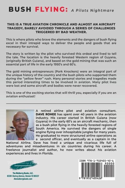 THIS IS A TRUE AVIATION CHRONICLE AND ALMOST AN AIRCRAFT TRAGEDY, BARELY AVOIDED THROUGH A SERIES OF CHALLENGES TRIGGERED BY BAD WEATHER. This is where pilots who brave the elements and the dangers of bush flying excel in their intrepid ways to deliver the people and goods that are necessary for survival. The story is written by the pilot who survived this ordeal and lived to tell the tale. The location is the heavily forested Western region of Guyana, (originally British Guiana), and based on the gold mining that was such an essential part of life in the early 1950s and '60s. The gold mining entrepreneurs (Pork Knockers) were an integral part of the unique history of the country and the bush pilots who supported them during the "yellow fever" rush. Many personal stories and tragedies made this period interesting times to be involved in aviation. Many pilot lives were lost and some aircraft and bodies were never recovered. This is one of the exciting stories that will thrill you, especially if you are an aviation enthusiast!