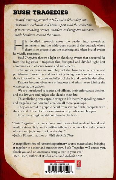 Award-winning journalist Bill Poulos delves deep into Australia's turbulent and lawless past with this collection of stories recalling crimes, murders and tragedies that once made headlines around the nation. His detailed research takes the reader into townships, settlements and the wide-open spaces of the outback where there is no escape from the shocking and often brutal events he vividly recreates. Bush Tragedies throws a light on shocking events that occurred far from the big cities - tragedies that disrupted and divided tight knit communities in obscure towns and settlements. The author takes us well beyond the bare facts of crime and punishment. Postscripts add fascinating backgrounds and outcomes to those involved - the cause and effect of the brutal deeds he describes. Readers become observers at inquests and trials, even joining the witnesses at the gallows. We are introduced to rogues and villains, their unfortunate victims, and the lawyers and judges who decide their fate. This rollicking time capsule brings to life the truly appalling crimes and tragedies that horrified a nation all those years ago. They are retold in graphic detail from start to finish, complete with the cut and thrust of cross-examinations by police and lawyers. It can be a tragic world out there in the bush . . .