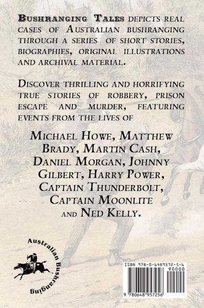 Bushranging Tales depicts real cases of Australian bushranging through a series of short stories, biographies, original illustrations and archival material. Discover thrilling and horrifying true stories of robbery, prison escape and murder, featuring events from the lives of Michael Howe, Matthew Brady, Martin Cash, Daniel Morgan, Johnny Gilbert, Harry Power, Captain Thunderbolt, Captain Moonlite and Ned Kelly.