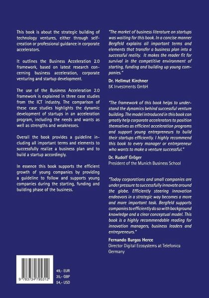 This book is about the strategic building of technology ventures, either through self-creation or professional guidance in corporate accelerators.It outlines the Acceleration 2.0 framework, based on latest research concerning business acceleration, corporate venturing and startup development.The "business Acceleration 2.0 framework is explained in three case studies. The comparison of the case studies from the ICT industry explains the dynamic development of startups, including the needs and wants as well as strengths and weaknesses. Overall the book provides a guideline including all important terms and elements to successfully realize a business plan and tobuild a startup accordingly. In essence this book supports the efficient growth of young companies by providing a guideline to follow and supports young companies during the starting, funding and building phase of the business.