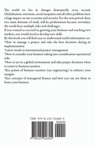 The world we live in changes dramatically every second. Globalization, terrorism, social inequities and all other problems have a huge impact on our economy and security. For the next period, these two main domains of study will be predominant because nowadays, the world faces multiple risks and challenges. If you wanted to succeed in growing your business and reaching new markets, you would need to develop new skills. By this book you will find easy-to-understand useful information on: *How to manage a project and take the best decisions during its implementation *Latest trends in international project management *How to consider your business taking into consideration operational risks *How to act in a global environment and take proper decisions when it comes to business taxation *Key points of business taxation (tax engineering) to enhance your margins *Key concepts of managerial finance and how you can use them to foster your business