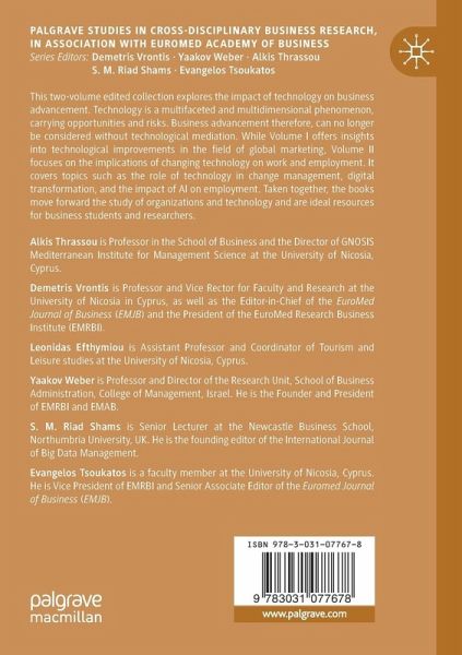 This two-volume edited collection explores the impact of technology on business advancement. Technology is a multifaceted and multidimensional phenomenon, carrying opportunities and risks. Business advancement therefore, can no longer be considered without technological mediation. While Volume I offers insights into technological improvements in the field of global marketing, Volume II focuses on the implications of changing technology on work and employment. It covers topics such as the role of technology in change management, digital transformation, and the impact of AI on employment. Taken together, the books move forward the study of organizations and technology and are ideal resources for business students and researchers.