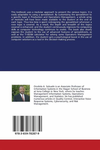 This textbook uses a modular approach to present the various topics. It is easily adaptable to using a spreadsheet. By customizing the spreadsheet to a specific topic in Production and Operations Management, a whole array of modules will have been made available to the student at the end of each topic. Thus less time is spent redesigning the spreadsheet whenever a new topic is covered. As a result, the depth and breadth of the topics covered is enhanced; and the student continuously improves his computing skills as computer technology continues to evolve. The book also clearly exposes the student to the use of advanced features of spreadsheets, as well as the TI-83/84 calculator for solving some Operatons Management problems. In addition, the student gets a psychological boost in the use of computer solutions as a tool in the decision-making process.