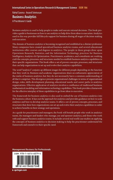 "In Business Analytics: A Practitioner's Guide, Rahul Saxena and Anand Srinivasan show an intimate understanding of this challenge. They provide background material on decision making in organizations, outline challenges that these organization face, and then point out methods for overcoming the challenges. ... With so many organizations trying to build analytical capabilities, this book is an excellent resource for those early in their journey. It will help them understand more clearly what is ahead and the pitfalls to avoid." (Jack Levis, Interfaces, Vol. 44 (6), November-December, 2014)