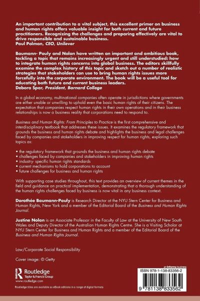 In a global economy, multinational companies often operate in jurisdictions where governments are either unable or unwilling to uphold even the basic human rights of their citizens. The expectation that companies respect human rights in their own operations and in their business relationships is now a business reality that corporations need to respond to. Business and Human Rights: From Principles to Practice is the first comprehensive and interdisciplinary textbook that addresses these issues. It examines the regulatory framework that grounds the business and human rights debate and highlights the business and legal challenges faced by companies and stakeholders in improving respect for human rights, exploring such topics as: the regulatory framework that grounds the business and human rights debate challenges faced by companies and stakeholders in improving human rights industry-specific human rights standards current mechanisms to hold corporations to account future challenges for business and human rights With supporting case studies throughout, this text provides an overview of current themes in the field and guidance on practical implementation, demonstrating that a thorough understanding of the human rights challenges faced by business is now vital in any business context.