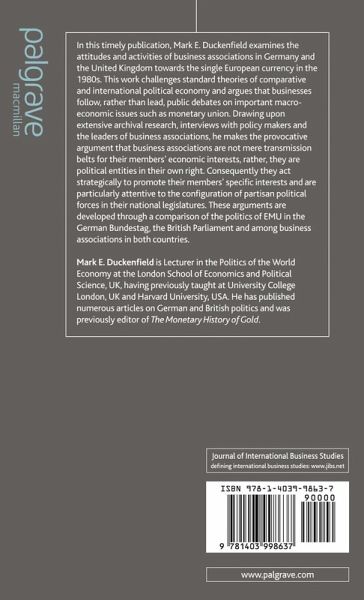 This book explores how British and German business associations formed their political attitudes towards Economic and Monetary Union between 1988 and 1998. With provocative argument and unique insight, it demonstrates how business associations are political entities in their own right, acting strategically to promote members' specific interests.