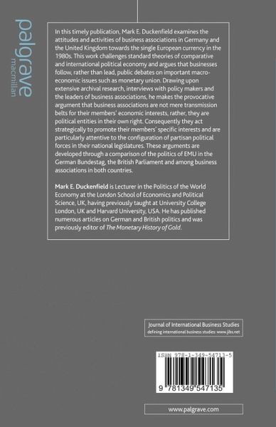This book explores how British and German business associations formed their political attitudes towards Economic and Monetary Union between 1988 and 1998. With provocative argument and unique insight, it demonstrates how business associations are political entities in their own right, acting strategically to promote members' specific interests.