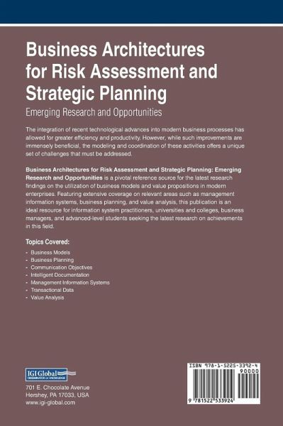 The integration of recent technological advances into modern business processes has allowed for greater efficiency and productivity. However, while such improvements are immensely beneficial, the modeling and coordination of these activities offers a unique set of challenges that must be addressed. Business Architectures for Risk Assessment and Strategic Planning: Emerging Research and Opportunities is a pivotal reference source for the latest research findings on the utilization of business models and value propositions in modern enterprises. Featuring extensive coverage on relevant areas such as management information systems, business planning, and value analysis, this publication is an ideal resource for information system practitioners, universities and colleges, business managers, and advanced-level students seeking the latest research on achievements in this field.