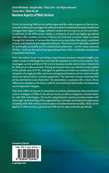 This book will be of interest to researchers in business development and practitioners such as managers of SMEs in the service sector, as well as computer scientists familiar with Web technologies. The book's comprehensive content provides readers with athorough understanding of the organizational, economic and technical implications of dealing with Web services as the nucleus of modern business models, which can be applied to Web services in general and Web service value networks specifically..