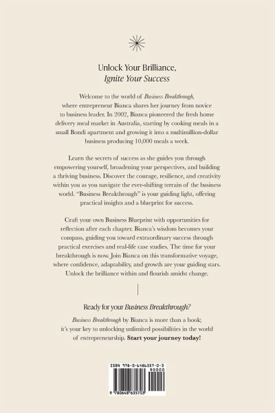 Unlock Your Brilliance, Ignite Your Success Welcome to the world of Business Breakthrough, where entrepreneur Bianca shares her journey from novice to business leader. In 2002, Bianca pioneered the fresh home delivery meal market in Australia, starting by cooking meals in a small Bondi apartment and growing it into a multimillion-dollar business producing 10,000 meals a week. Learn the secrets of success as she guides you through empowering yourself, broadening your perspectives, and building a thriving business. Discover the courage, resilience, and creativity within you as you navigate the ever-shifting terrain of the business world. "Business Breakthrough" is your guiding light, offering practical insights and a blueprint for success. Craft your own Business Blueprint with opportunities for reflection after each chapter. Bianca's wisdom becomes your compass, guiding you toward extraordinary success through practical exercises and real-life case studies. The time for your breakthrough is now. Join Bianca on this transformative voyage, where confidence, adaptability, and growth are your guiding stars. Unlock the brilliance within and flourish amidst change. Ready for your Business Breakthrough? Business Breakthrough by Bianca is more than a book; it's your key to unlocking unlimited possibilities in the world of entrepreneurship. START YOUR JOURNEY TODAY!
