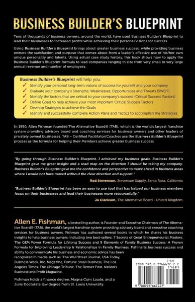 TENS OF THOUSANDS OF BUSINESS OWNERS, AROUND THE WORLD, HAVE USED BUSINESS BUILDER'S BLUEPRINT TO LEAD THEIR BUSINESSES TO INCREASED PROFITS WHILE ACHIEVING THEIR PERSONAL VISIONS FOR SUCCESS In 1990, Allen E Fishman founded The Alternative Board® (TAB), which is the world's largest franchise system providing advisory board and coaching services for business owners and other leaders of privately owned businesses. TAB - Certified Facilitator/Coaches use the Business Builder's Blueprint process as the formula for helping their members achieve greater business success. Using Business Builder's Blueprint brings about greater business success, while providing business owners the satisfaction and purpose that comes about from a leader's effective use of his/her own unique personality and talents. Using actual case study history, this book shows how to apply the Business Builder's Blueprint formula to lead companies ranging in size from very small to very large annual revenue and number of employees. BUSINESS BUILDER'S BLUEPRINT WILL HELP YOU: Identify your personal long-term visions of success for yourself and your company Evaluate your company's Strengths, Weaknesses, Opportunities and Threats (SWOT) Identify the factors that are critical to your company's success (Critical Success Factors) Define Goals to help achieve your most important Critical Success Factors (driving Critical Success Factor) Develop Strategies to achieve the Goals Identify and successfully complete Action Plans and Tactics to accomplish the Strategies