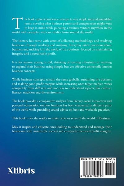 The book explores businesses concepts in very simple and understandable terms, covering what business persons and entrepreneurs might want to keep in mind while pursuing a business venture anywhere in the world with examples and case studies from around the world. The literary has come with years of collecting methodology and studying businesses through working and studying. Everyday asked questions about business and making it in the world of true business, focused on maintaining integrity and a sustainable profit. It is for anyone young or old, thinking of starting a business or wanting to expand their business using simple but yet effective universally known business concepts While business concepts remain the same globally, sustaining the business and making good profit margins while increasing ones target market, varies completely from different and not easy to understand aspects; like culture, literacy, tradition and the environment. The book provides a comparative analysis from literary, social interaction and personal observation on how business has been transacted in different parts of the world while providing sound advice on best and workable practices. This book is for the reader to make cents or sense of the world of Business. May it inspire and educate ones looking to understand and manage their businesses with sustainable success and consistent increased profit margins.