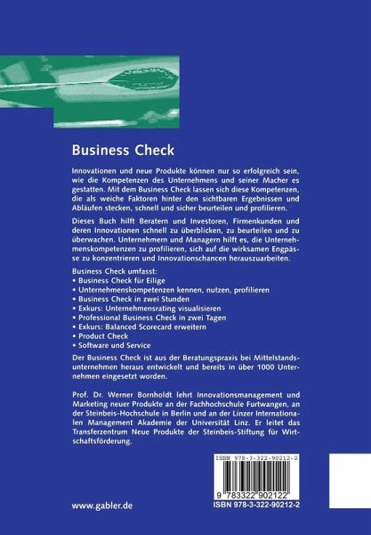 Business Check hilft, ein Unternehmen, eine Geschäftseinheit, ein Produkt oder ein Projekt sehr schnell zu überblicken und zu beurteilen. Sowohl Manager in Unternehmen als auch Analysten und Investoren erkennen, welches die wirklich wichtigen Erfolgsfaktoren sind, welche Maßnahmen man unternehmen bzw. unterlassen sollte. Die vermittelten Erkenntnisse und Erfahrungen stammen aus des Praxis: aus Beratungen, Begutachtungen und Seminaren.