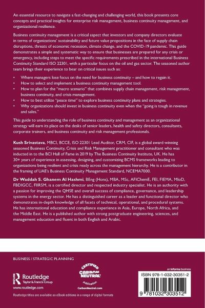 An essential resource to navigate a fast-changing and challenging world, this book presents core concepts and practical insights for enterprise risk management, business continuity management, and organizational resilience. Business continuity management is a critical aspect that investors and company directors evaluate in terms of an organizations' sustainability and future value propositions in the face of supply chain disruptions, threats of economic recession, climate change, and the COVID-19 pandemic. This guide demonstrates a simple and systematic way to ensure that businesses are…mehr