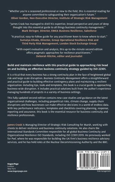 Build and maintain resiliency with this practical guide to approaching risk head on and building an effective business continuity strategy. It is critical that every business has a strong continuity plan in the face of heightened global risk and large-scale disruption. Business Continuity Management offers a straightforward and practical guide to building effective contingency plans and maintaining a resilient organization. Including tips, tools and templates, this book is a crucial guide to approaching business-wide disruption. It includes practical solutions built from the author's personal experience managing hundreds of projects in a variety of business settings. This fully updated edition contains new case studies and guidance on the latest organizational challenges, including geopolitical risks, climate change, supply chain disruptions and how businesses can make effective decisions in a world of endless data. With key performance indicators, templates and checklists covering planning, response, reporting and assurance, this book is the essential resource for business continuity and resilience professionals.