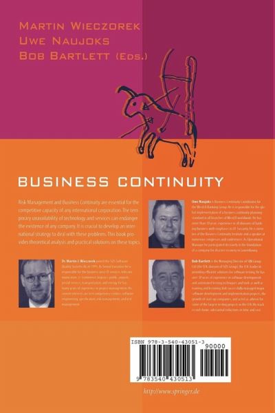 I Overview and General Aspects.- Operational Risks and Business Continuity? An Essayistic Overview.- The Role of States and of International and National Organisations as Super-Risk managers.- Position of the "Internal Audit Department" in a BCP Project.- Crisis Management for a New Century.- II Business and System Operation.- Business Continuity Planning (BCP) in a Globalised Bank.- Verification/Testing and Monitoring of Business Continuity Plans.- The Benefits of BCP Tools, with Special Reference to CAPT® and CM®.- Creating the Complete Environment for the Survival of a Bank.- Robustness Provided by Internet Monitoring Systems.- III Software and System Supply.- Risk Management for IT and Software Projects.- The Control of IT Risk by Means of Risk-Based Testing.- Software Reengineering for Mission-Critical Applications - Minimizing Business Risks and Reducing Maintenance Costs.- References.