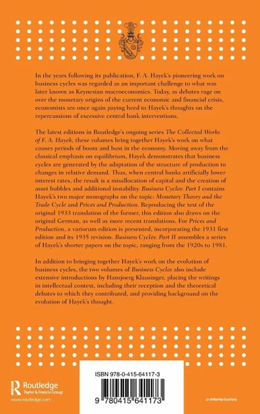 In the years following its publication, F. A. Hayek's pioneering work on business cycles was regarded as an important challenge to what was later known as Keynesian macroeconomics. Today, as debates rage on over the monetary origins of the current economic and financial crisis, economists are once again paying heed to Hayek's thoughts on the repercussions of excessive central bank interventions. The latest editions in Routledge's ongoing series The Collected Works of F. A. Hayek, these volumes bring together Hayek's work on what causes periods of boom and bust in the economy. Moving away from the classical emphasis on equilibrium, Hayek demonstrates that business cycles are generated by the adaptation of the structure of production to changes in relative demand. Thus, when central banks artificially lower interest rates, the result is a misallocation of capital and the creation of asset bubbles and additional instability. Business Cycles: Part I contains Hayek's two major monographs on the topic: Monetary Theory and the Trade Cycle and Prices and Production. Reproducing the text of the original 1933 translation of the former, this edition also draws on the original German, as well as more recent translations. For Prices and Production, a variorum edition is presented, incorporating the 1931 first edition and its 1935 revision. Business Cycles: Part II assembles a series of Hayek's shorter papers on the topic, ranging from the 1920s to 1981. In addition to bringing together Hayek's work on the evolution of business cycles, the two volumes of Business Cycles also include extensive introductions by Hansjoerg Klausinger, placing the writings in intellectual context, including their reception and the theoretical debates to which they contributed, and providing background on the evolution of Hayek's thought.