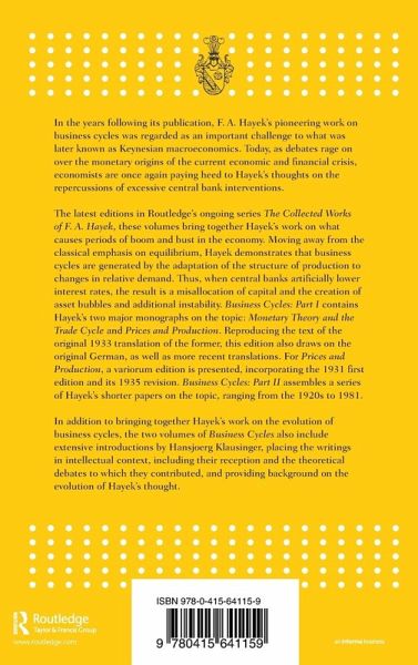 In the years following its publication, F. A. Hayek's pioneering work on business cycles was regarded as an important challenge to what was later known as Keynesian macroeconomics. Today, as debates rage on over the monetary origins of the current economic and financial crisis, economists are once again paying heed to Hayek's thoughts on the repercussions of excessive central bank interventions. The latest editions in Routledge's ongoing series The Collected Works of F. A. Hayek, these volumes bring together Hayek's work on what causes periods of boom and bust in the economy. Moving away from the classical emphasis on equilibrium, Hayek demonstrates that business cycles are generated by the adaptation of the structure of production to changes in relative demand. Thus, when central banks artificially lower interest rates, the result is a misallocation of capital and the creation of asset bubbles and additional instability. Business Cycles: Part I contains Hayek's two major monographs on the topic: Monetary Theory and the Trade Cycle and Prices and Production. Reproducing the text of the original 1933 translation of the former, this edition also draws on the original German, as well as more recent translations. For Prices and Production, a variorum edition is presented, incorporating the 1931 first edition and its 1935 revision. Business Cycles: Part II assembles a series of Hayek's shorter papers on the topic, ranging from the 1920s to 1981. In addition to bringing together Hayek's work on the evolution of business cycles, the two volumes of Business Cycles also include extensive introductions by Hansjoerg Klausinger, placing the writings in intellectual context, including their reception and the theoretical debates to which they contributed, and providing background on the evolution of Hayek's thought.